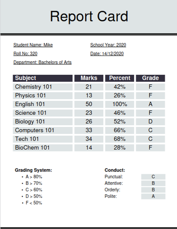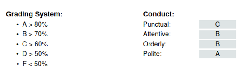 The rest of the report consists of the grading scheme and the conduct which was again generated using the tables and formatted using the cell Style struct that we defined earlier. The Grading scheme is a one column table that displays how grades were assigned and the conduct is a two column table to define conduct for each student. The alignment of these tables was done with a 12-column alignment grid table where the grade and conduct tables were placed at column column 1 and 8 respectively, spawning 3 and 5 columns each.